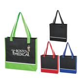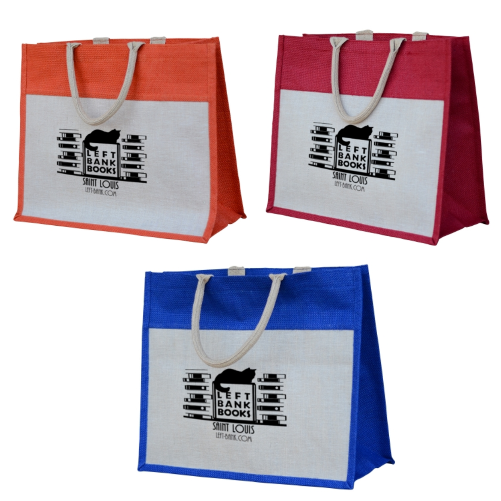 Colored Jute fabric with natural Juco front panel is both fashionable and functionable. The Juco (Jute Cotton blend) fabric's smoother texture allows more detailed imprint. A large rectangular main compartment is ideal for heavy loads of brochures and paperwork while the soft, rolled handle provides comfort.
