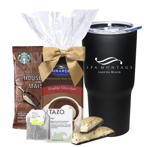 Starbucks coffee, Ghirardelli Cocoa, Tazo Tea and Cookie all tucked inside Double wall 20 oz stainless tumbler. Each tumbler is wrapped in clear cello and tied with a bow. Can be customized to fit your event needs. Full color gift tag and gift box options available.
