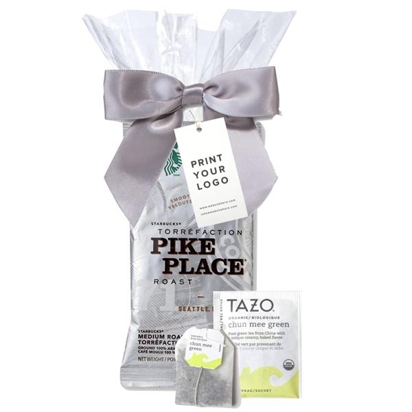 Stuff your own mug with this ready-to-go Starbucks Coffee pack and 2-Tazo Tea Bags mug stuffer kit. Coffee pack will brew up to 10 cups of Starbucks Coffee. Packaged in clear cello and tied with a bow for easy insert into your mug or for easy hand-out at your next event. Full color gift tag & kitting services available. We'll customize a stuffer to fit your budget and event needs.