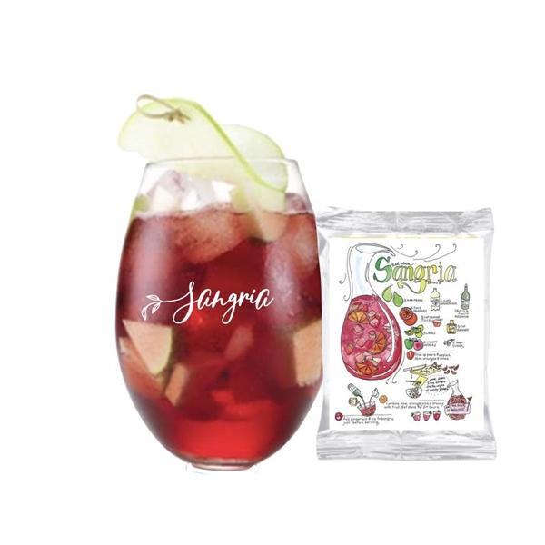 Mix up your own sangria at home. Includes stemless glass with sangria mix tucked inside. Just add your own wine, seltzer and fruit. Each wrapped in cello and tied with bow. Design your own full color label for mix package or item will be left blank. Full color hang tag and drop shipping available.