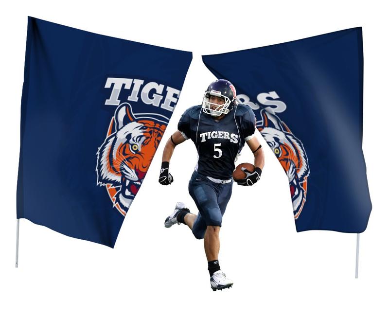 Break through to victory at your next sports or team-building event with this breakaway banner! Made of 110G knit polyester, this 6' x 10' two-piece banner has a hook and loop attachment that allows players/participants to run through for a fun and spirit-building effect! Use it again and again. Make an entrance with this eye-catching promotional product available for digital inkjet full color direct imprinting, so you can display your school, sports team, organizational or company's logo, slogan or trademark.