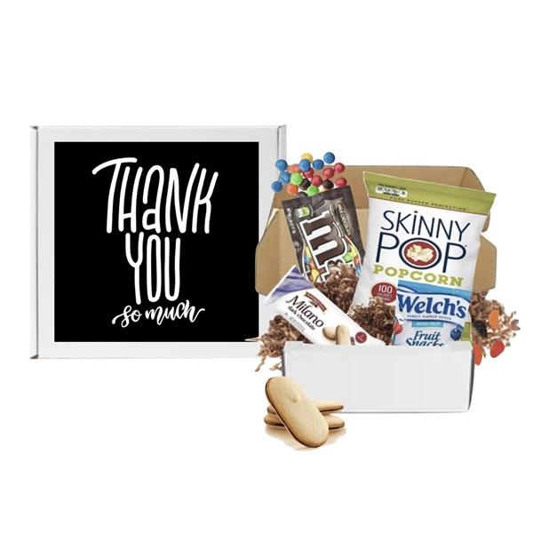 No Minimum and Same Day Shipping Available. Drop Ship Ready! Just add shipping label. Assorted brand name snacks tucked inside white box with crinkle shred and Thank You So Much printed label on box lid to show your appreciation. Label can be customized with your own message and logo. Optional full color box label, card insert and drop shipping available. Snack substitution may apply for equal or greater value.