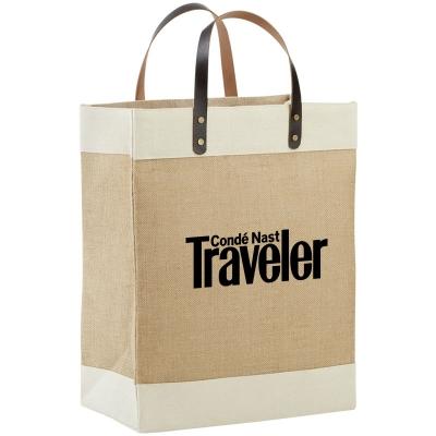 This is a laminated jute market tote with cotton accents and leather handles. They are perfect for everyday outings, shopping, carrying items for daily needs. These eco-friendly tote bags are made from renewable, sustainable jute fibers. Reusable & Bio-Degradable.