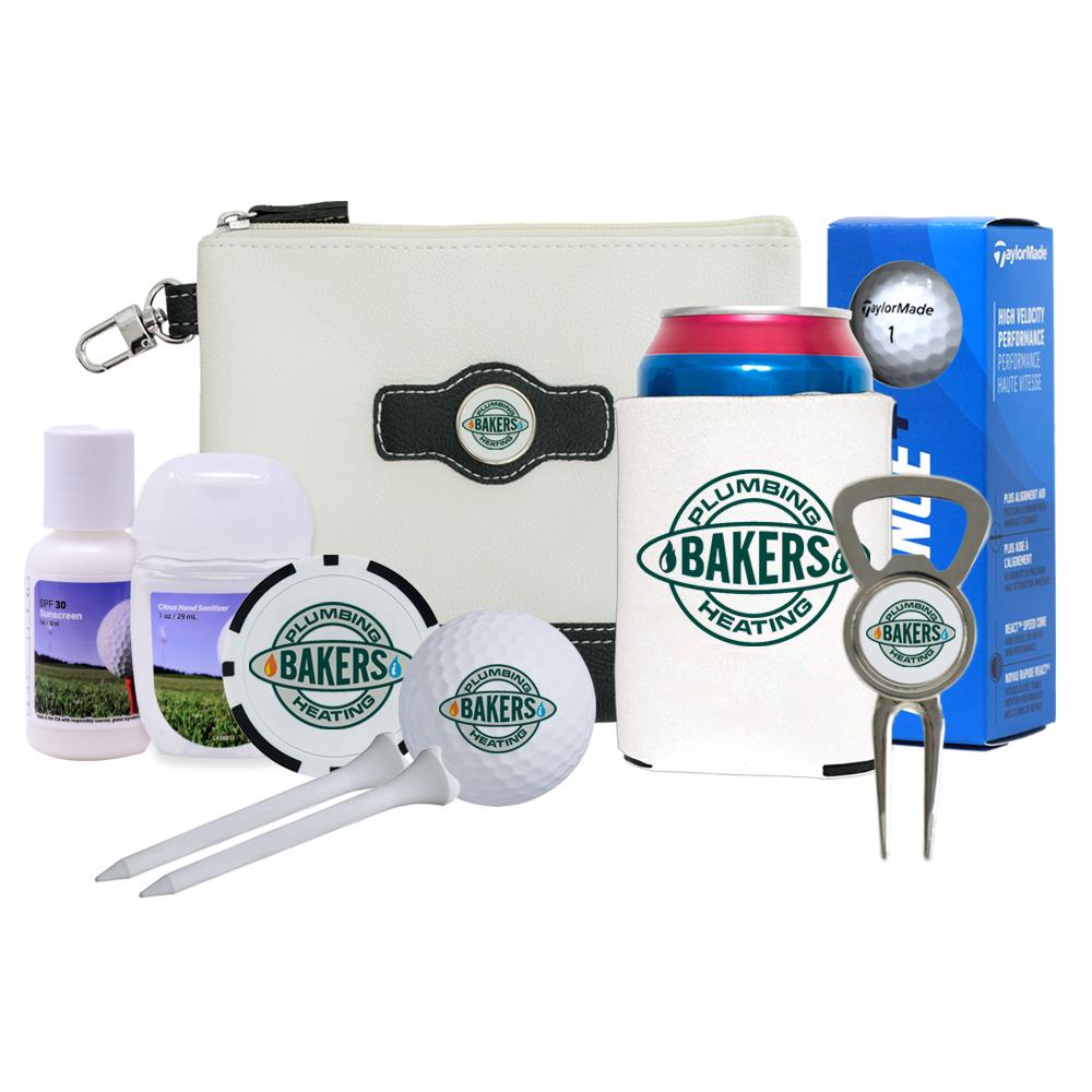 The Players Golf Kits includes three TaylorMade Distance Plus golf balls, a collapsible can cooler, a bottle opener divot tool, poker chip ball marker, two blank 2-3/4 Performance white tees, a one oz. spf30 sunscreen, and a one oz hand sanitizer. All packaged in a leatherette zippered pouch. Price includes a full color imprint on golf balls, divot tool, poker chip ball marker, pouch, and a one color imprint on the can cooler. Tees are blank and can be printed for an upcharge. Sunscreen and hand sanitizer are not customizable.