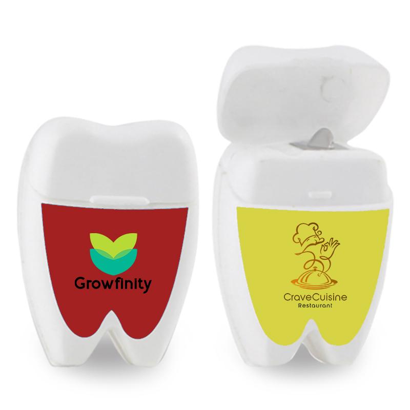 Show those pearly whites with this creative tooth shaped dental floss. This mint flavored floss provides 12 yards of durable cleaning floss in a playful tooth shaped container! Each container includes a full color decal to provide you with a stylish retail look. This product is great for dentistry practices, pharmacies or medical themed events.