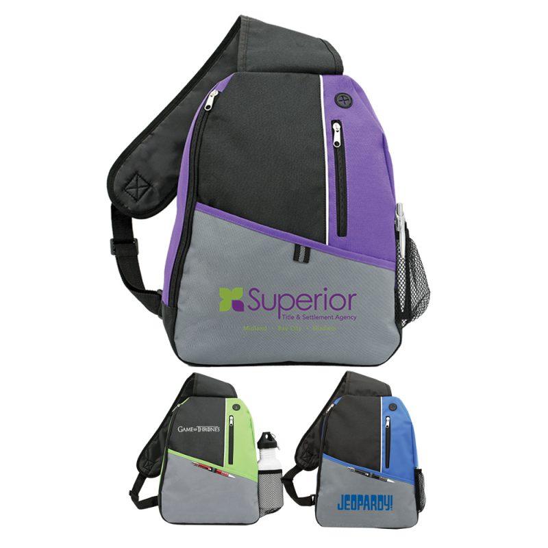 The bag is styled similar to a conventional backpack but balanced for a one-sholder design- with padding on the back and strap. The bag also features a headset keyhole- so you never have to stop the music. The zipper pocket on the front and mesh pocket on the side keep your accessories close at hand. Made of 600D polyester. Size: L x W x H: 4" x 12" x 16" Imprint Area: 4"W x 5"H.