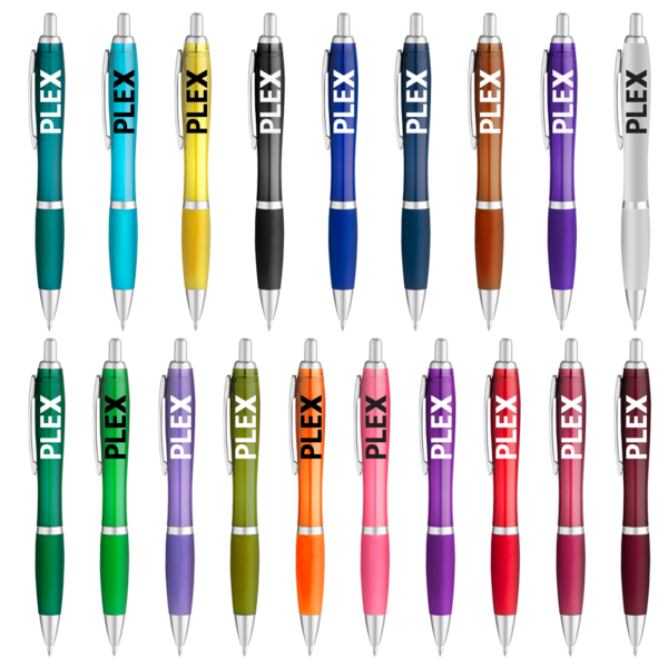 Translucent color curvaceous barrel; shiny silver accents and matching bold color rubberized comfort grip. Metallic silver finish. Comes with black ink. *silver pen has no rubberized grip.