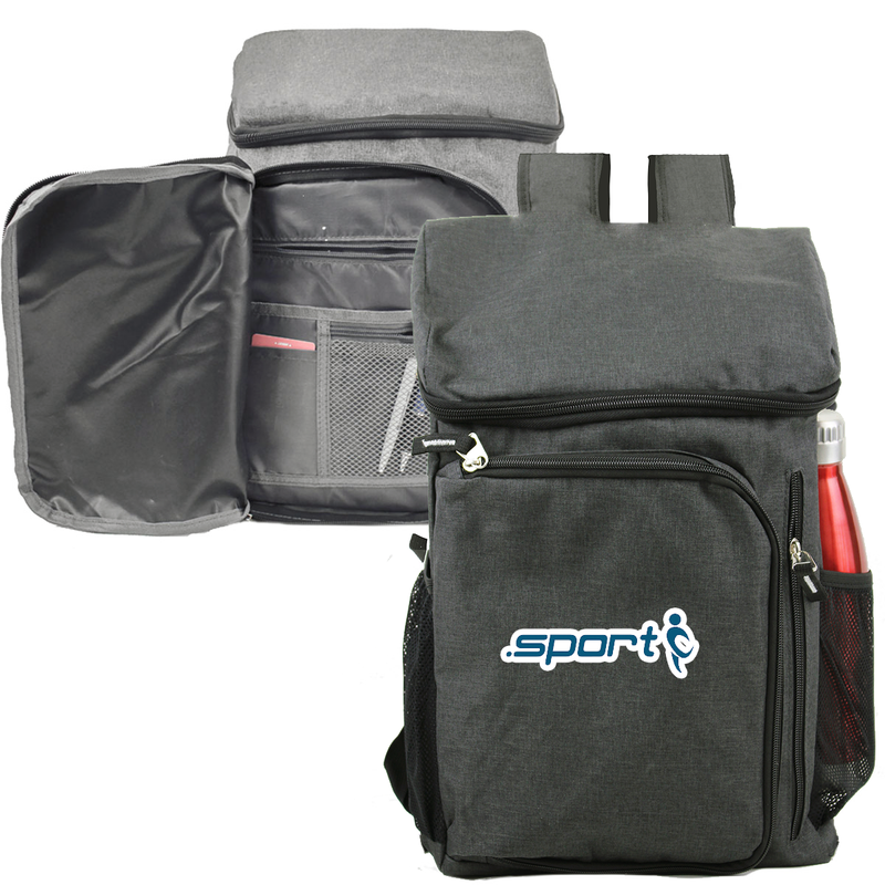 Wide zippered opening; Interior padded laptop compartment; Vertical zipper front pocket; Easy zip front pocket with organizer inside; 2 Side mesh pockets; Top carry handle; Comfortable adjustable shoulder straps.