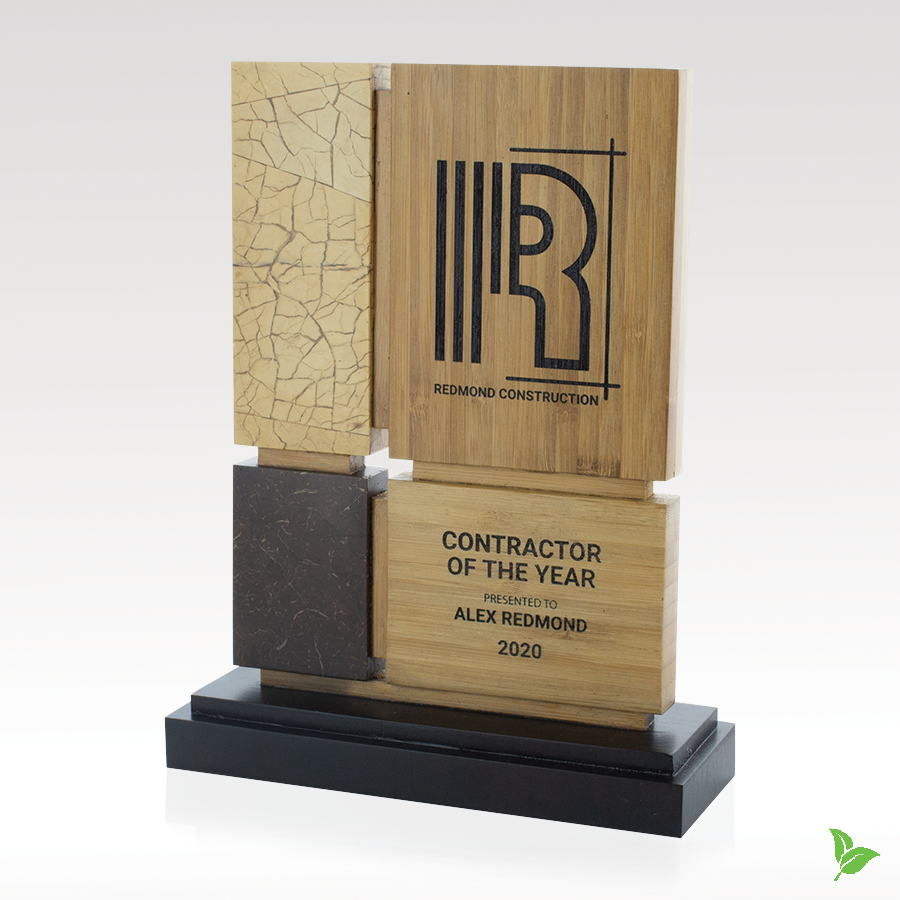 The warm harmony of two shades of bamboo marries with white and brown coconut shell creating a handsome, eco-friendly award conjuring the feel of natural environs while expressing your message. 9.00" W x 11.50" H x 2.50" D