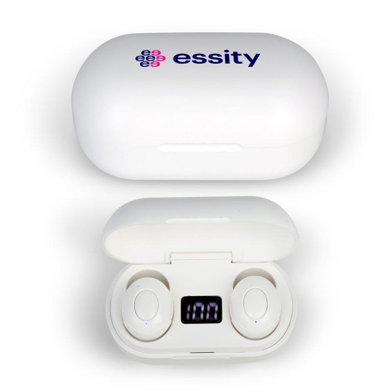 Rechargeable 350 mAh battery providews 4 hours of playtime. Bluetooth 5.0 produces quality audio up to 30 feet. Pair w/ your music player w/ play, skip, & volume up/down functionality. LCD inside charge case show battery level. SIZE: L x W x H: 2.75" x 1.5" x 1.25"