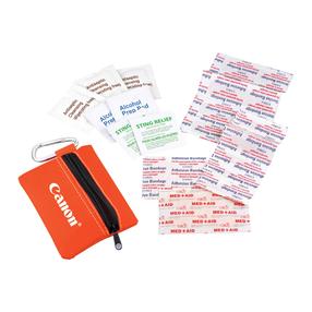 - First-aid kit includes: silver mini carabiner, 3 antiseptic cleaning wipes, 5 standard size adhesive bandages, 6 small adhesive bandages, 1adhesive butterfly bandage, 1 adhesive knuckle bandage, 2 alcohol wipes and 2 sting-relief wipes.