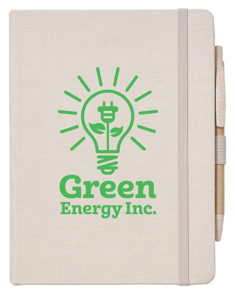 Hard cover Hemp journal; Hard cover journal including 80 sheets of 70 GSM beige wide ruled recycled paper matching elastic pen loop and elastic band; Includes a Kraft paper barrel pen with ABS Wheat Straw clip and black ink; Product Size: 6" w x 8.0125" h x 0.5" d;